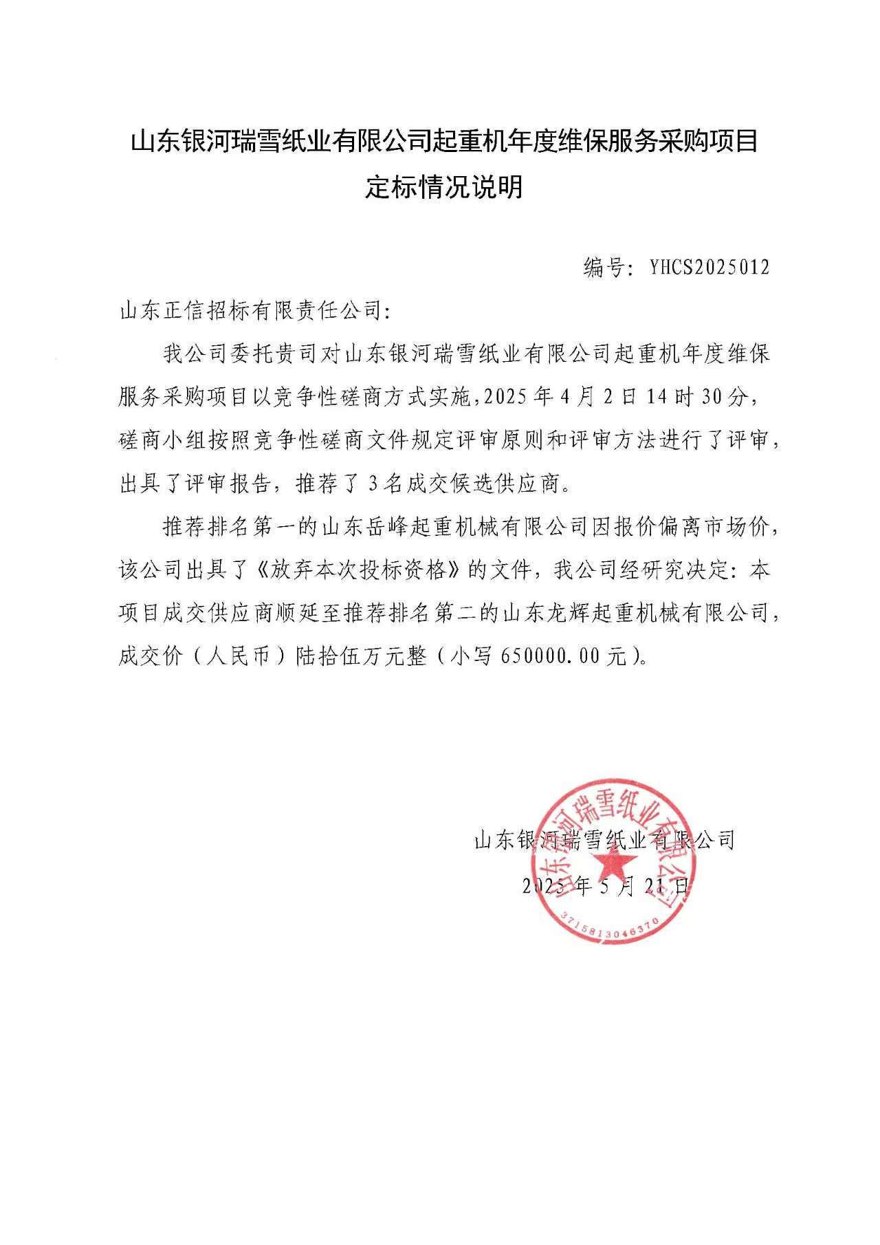 山東銀河瑞雪紙業有限公司起重機年度維保服務采購項目成交結果公告