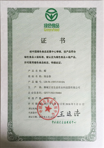 5月26日,正信生態農業科技園“綠業春”醬油、食醋被中國綠色食品發展中心認定為綠色食品“A級”產品,并許可使用綠色食品標志。