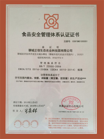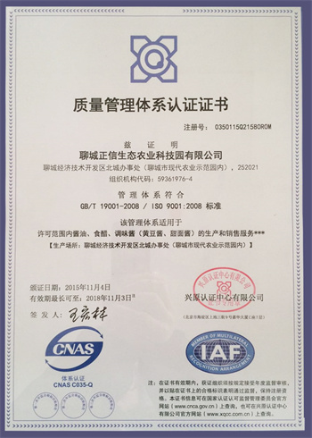 11月份,生態(tài)園的質(zhì)量管理體系認證證書和食品安全管理體系認證證書正式下發(fā)。證書自2015年9月份起,已生效。